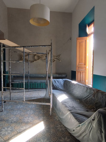 Acabados interiores: aplicación controlada de recubrimientos contemporáneos pintura vinílica, pasta tipo microcemento y mosaicos hidráulicos artesanales con motivo de escamas en muros estratégicos para destacar elementos arquitectónicos.